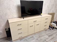 Огромный вместительный комод больше двух метров, огромная вместимость и при этом выглядит легко, за счет небольшой глубины удобно встал в простенок. Я очень довольна и внешним видом и функциональностью.