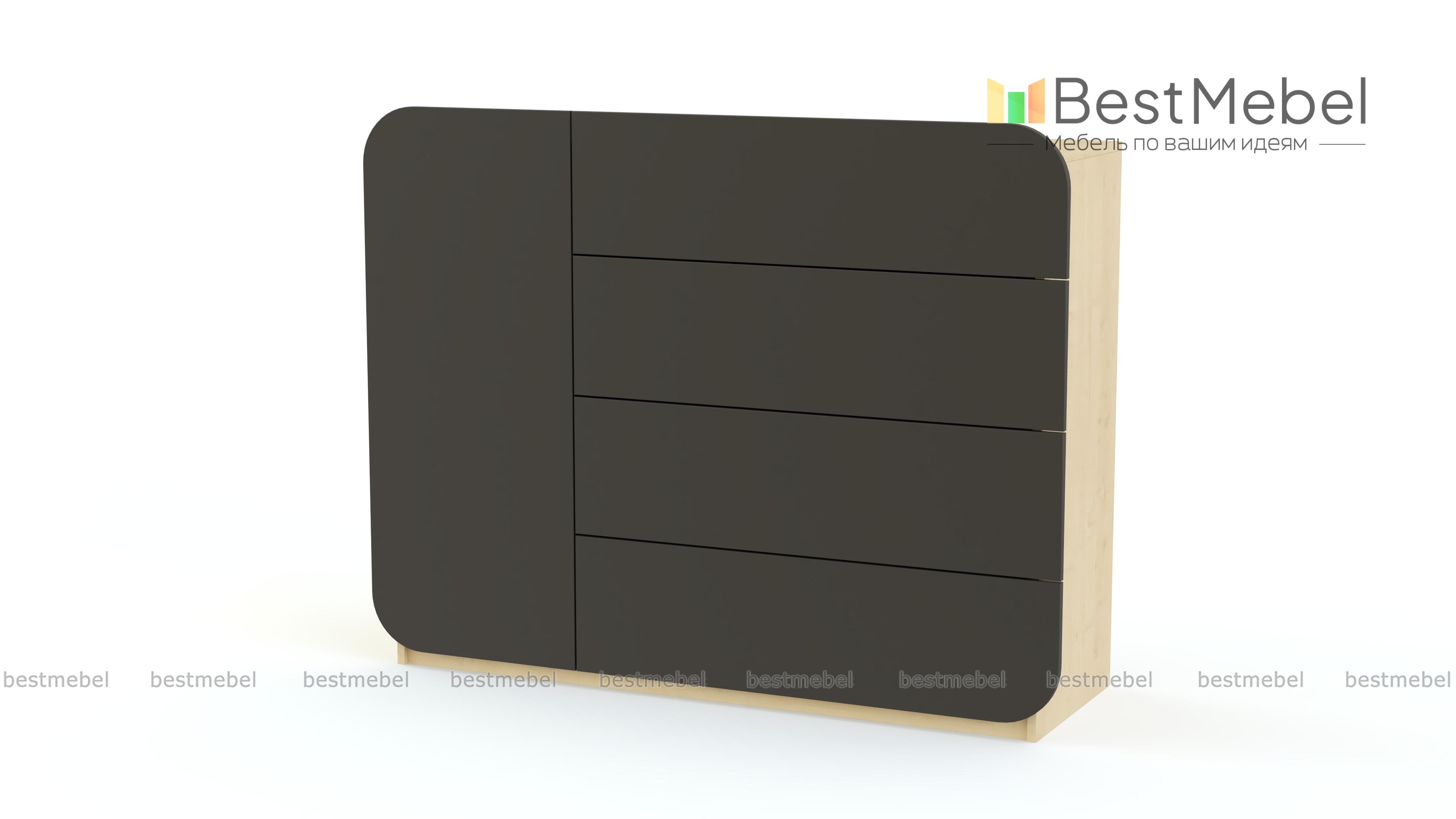 Нестандартный дизайн и насыщенная расцветка – это модель для смелых идей в интерьере и современных решений. Четыре выдвижных отделения и одно распашное имеют матовые фасады без ручек, скругленные по краям. Компактный и вместительный, комод МБ 32.1 BMS позволит разместить все необходимые в гостиной, спальне или прихожей мелочи. Столешница подойдет для ТВ или выгодно представит предметы декора. Приобрести модель по доступной цене приглашаем в наш интернет-магазин.
