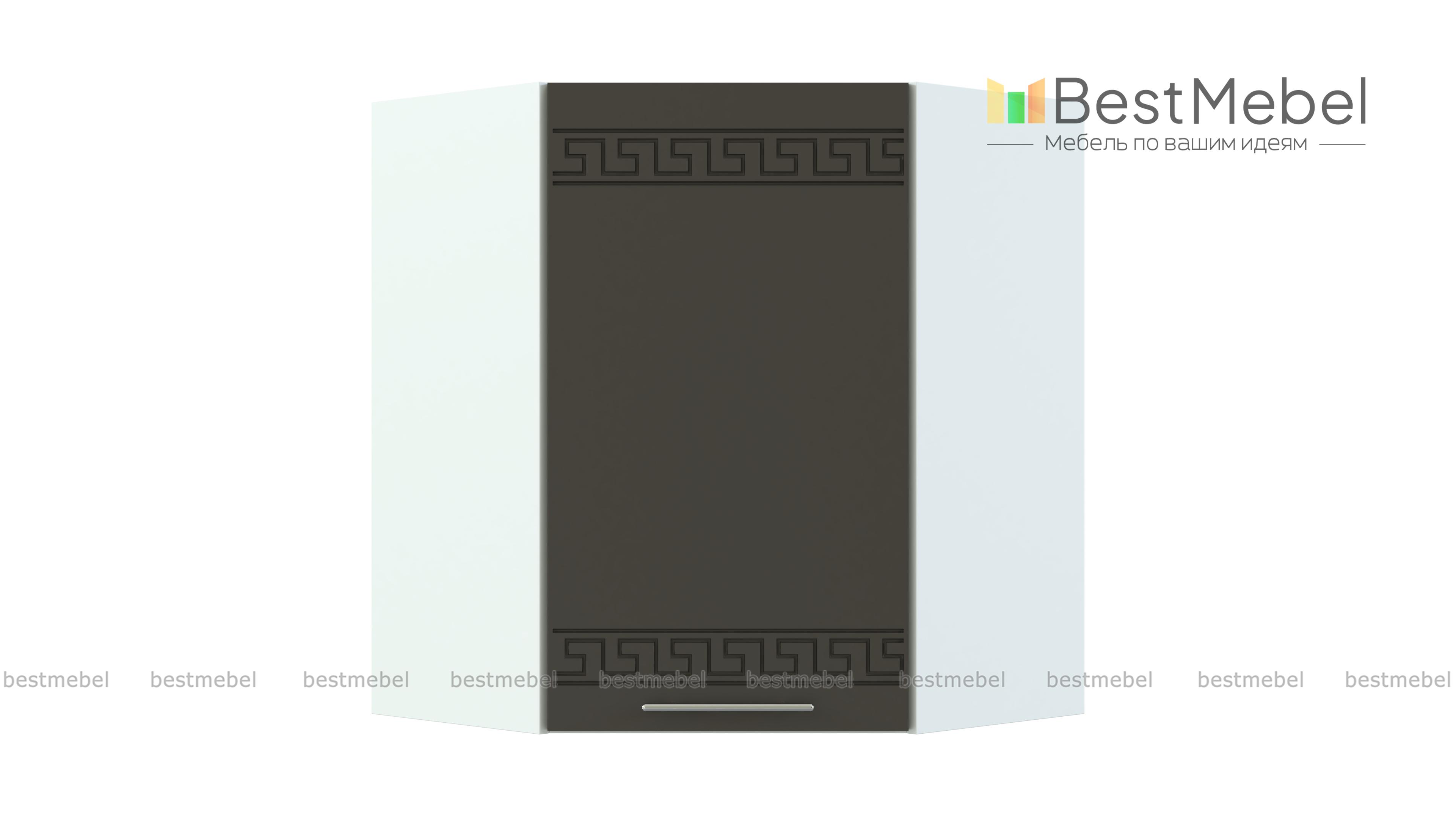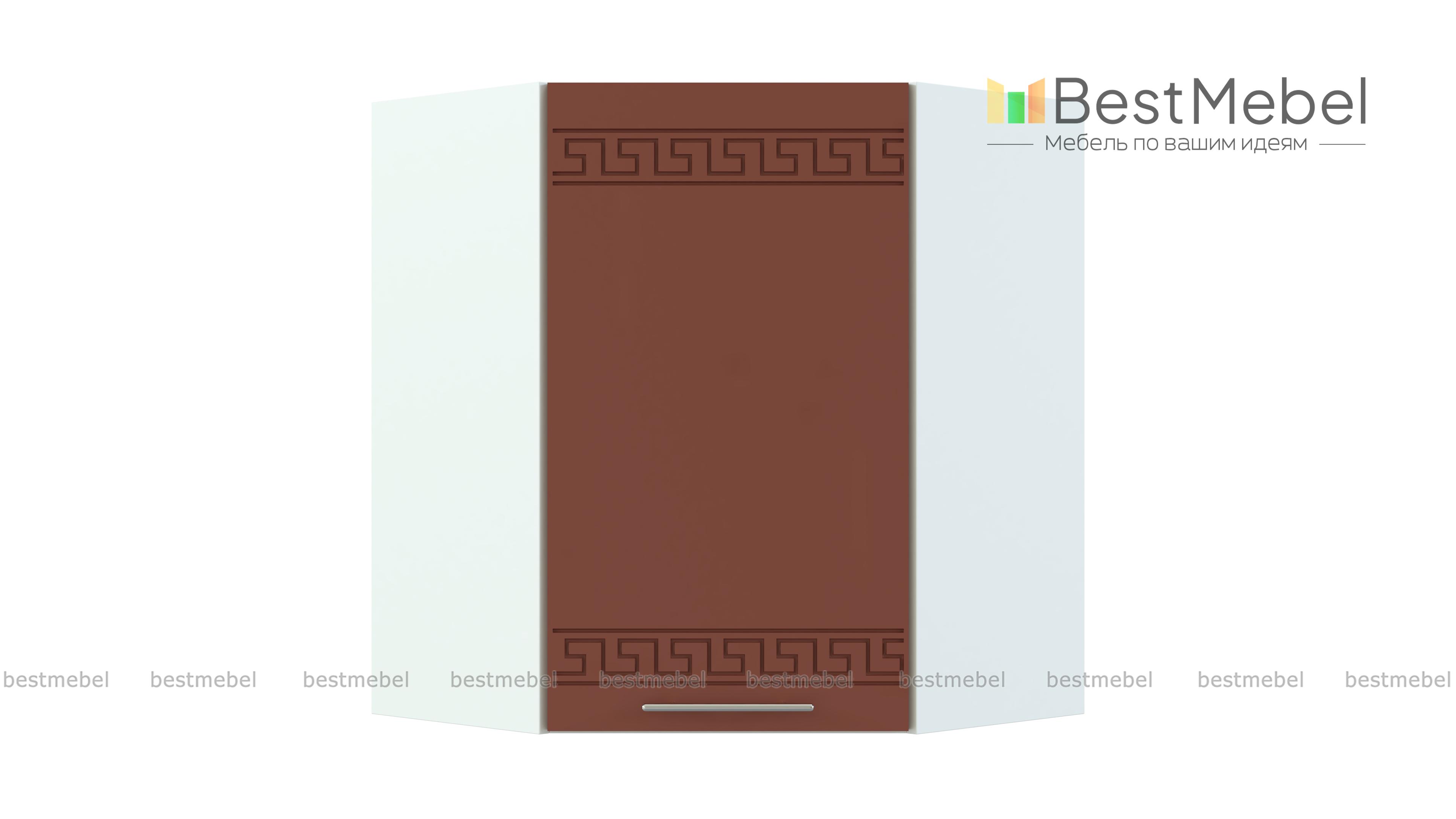 Шкаф навесной угловой 590 Греция BMS незаменим в комплекте Г-образной формы и служит для соединения модулей верхнего ряда. Компактный внешне, шкаф выгодно использует угловое пространство. За глухой распашной дверцей – просторное отделение с полкой для хранения кухонных принадлежностей. Фасад, выполненный в белом матовом оттенке, украшен орнаментом и отличается устойчивостью к влаге, механическим повреждениям и простотой ухода. Купить шкаф навесной угловой 590 Греция BMS по демократичной цене вы сможете в нашем интернет-магазине.