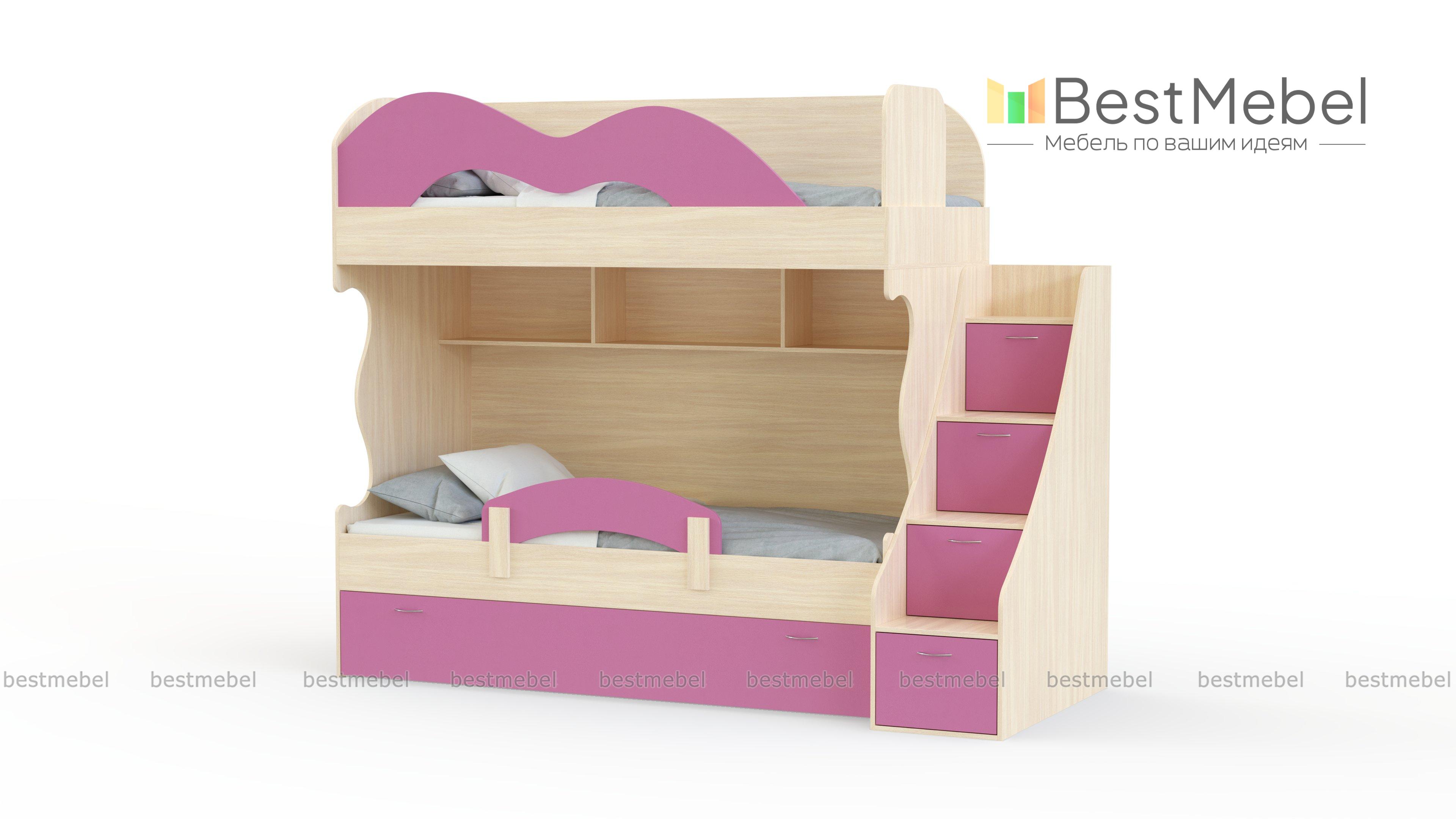 Детская двухъярусная кровать Бамбини BMS сочетает в себе комфорт, уют и безопасность. Спальные места первого и второго яруса оборудованы фигурно вырезанными защитными бортиками и боковинами без острых углов. Дополнительные места для хранения постельных принадлежностей, игрушек и книг создают выкатной ящик в основании, оснащенная под ступеньками ящиками приставная лестница и открытые полки. Купить детскую двухъярусную кровать Бамбини BMS вы сможете в нашем интернет-магазине, подобрав размеры и цветовую гамму.