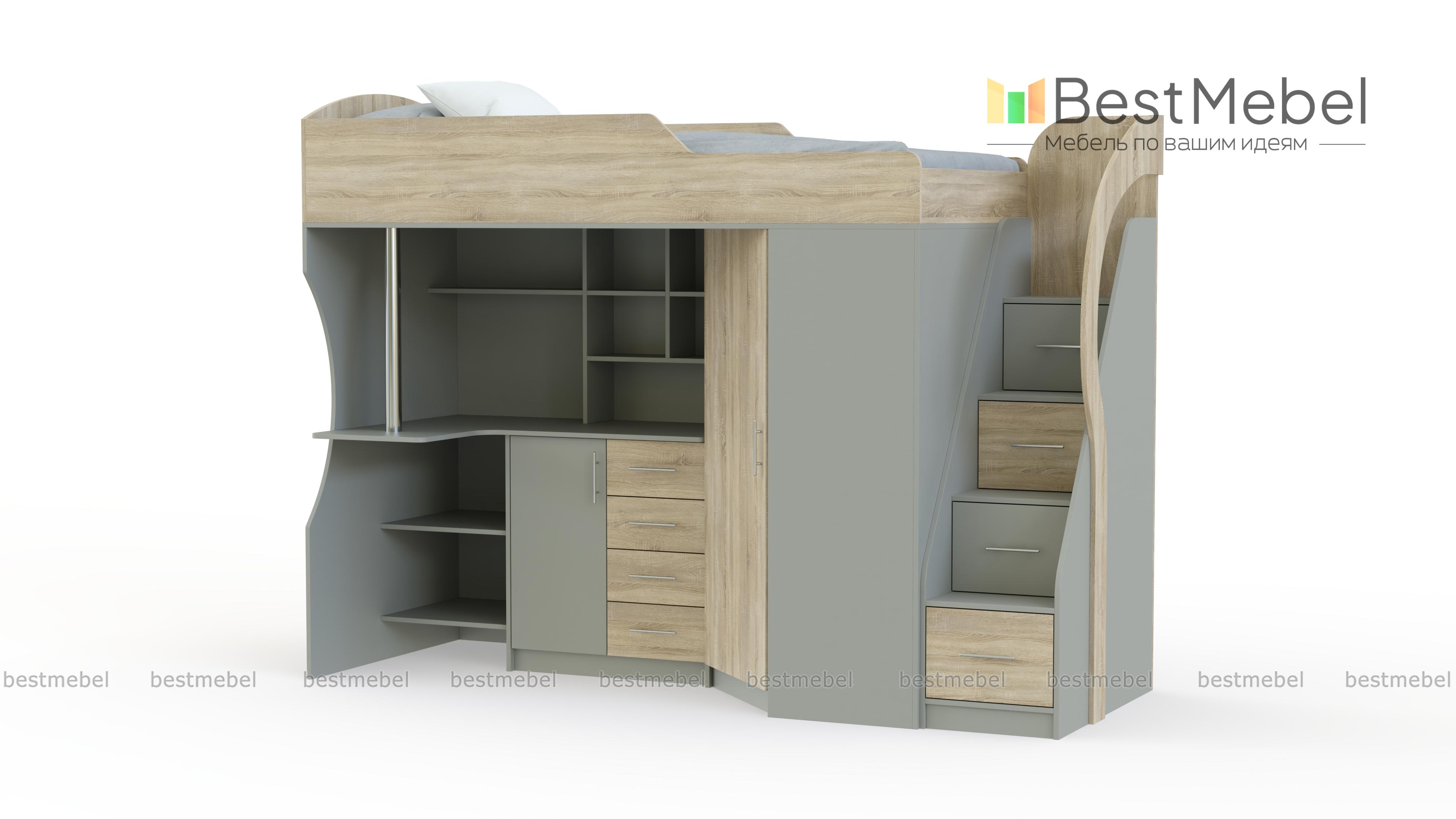 Детская кровать-чердак Мерабель 1.1 BMS – это многофункциональная конструкция, которая позволит сэкономить пространство для активных игр. Помимо полноценного спального места модель оборудована рабочей зоной с угловым столиком, тумбой и просторными нишами, распашным шкафом для одежды и лестницей-горкой с вместительными ящиками для игрушек под ступеньками. Безопасность обеспечат экологичные материалы, защитный бортик и устойчивая лестница с перилами. Купить детскую кровать-чердак Мерабель 1.1 BMS для яркого позитивного интерьера приглашаем в наш интернет-магазин.
