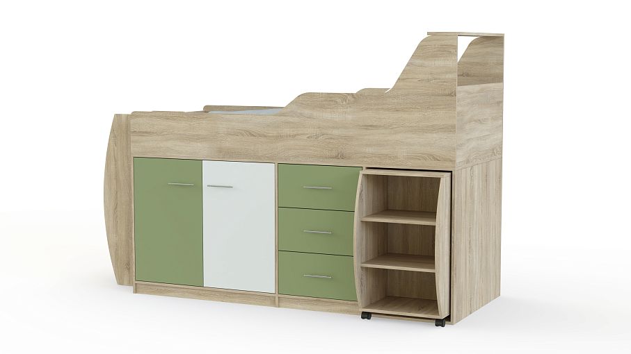 Кровать-чердак Минимакс BMS представляет собой мебельный комплекс, объединивший зону отдыха с удобной системой хранения и местом для творческих занятий. Незаменимая в малогабаритных квартирах, композиция включает в себя просторное спальное место с полкой в изголовье и защитными бортиками, устойчивую лестницу и расположенные на первом ярусе выдвижные ящики, распашное отделение и выкатной столик с мини-стеллажом. Яркий дизайн порадует ребенка и создаст в помещении комфортную атмосферу. Купить кровать-чердак Минимакс BMS приглашаем в наш интернет-магазин.