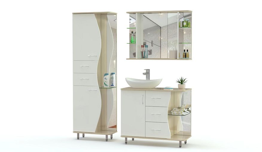 Комплект для ванной комнаты Стайн 3 BMS эффектно сочетает в оформлении яркий контрастный глянец, зеркала и хромированные элементы. Ультрасовременная композиция для просторного помещения включает в себя напольную тумбу под раковину, высокий пенал и навесное зеркало с боковыми полочками для мелочей. Распашные, выдвижные отделения и открытые секции сделают хранение максимально удобным, а волнообразно вырезанные фасады станут украшением интерьера. Купить комплект для ванной комнаты Стайн 3 BMS приглашаем к нам в интернет-магазин.