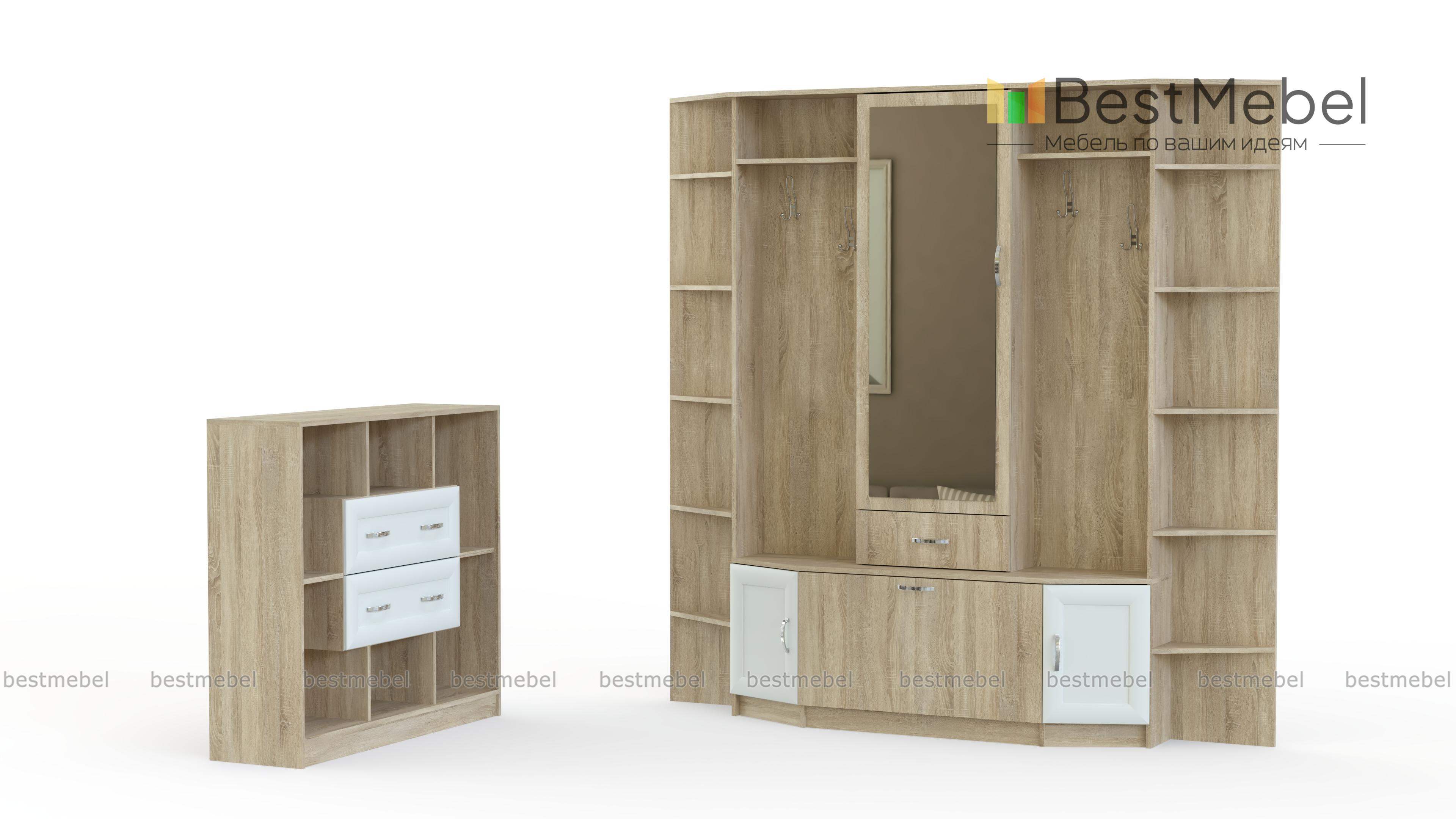 Прихожая Гаурон №2.1 BMS – практичный и доступный по цене комплект в классическом стиле. Прихожую отличают удобные средние габариты и модульная конструкция из нескольких элементов. В единую композицию объединены зеркальный шкафчик с полками и выдвижным ящиком, обувница, открытые панели с крючками и торцевой стеллаж, удобный для размещения средств по уходу и предметов декора. Дополняет модуль комбинированная тумба с выдвижными ящиками и расположенными по периметру нишами. Купить прихожую Гаурон №2.1 BMS недорого вы сможете в нашем интернет-магазине.