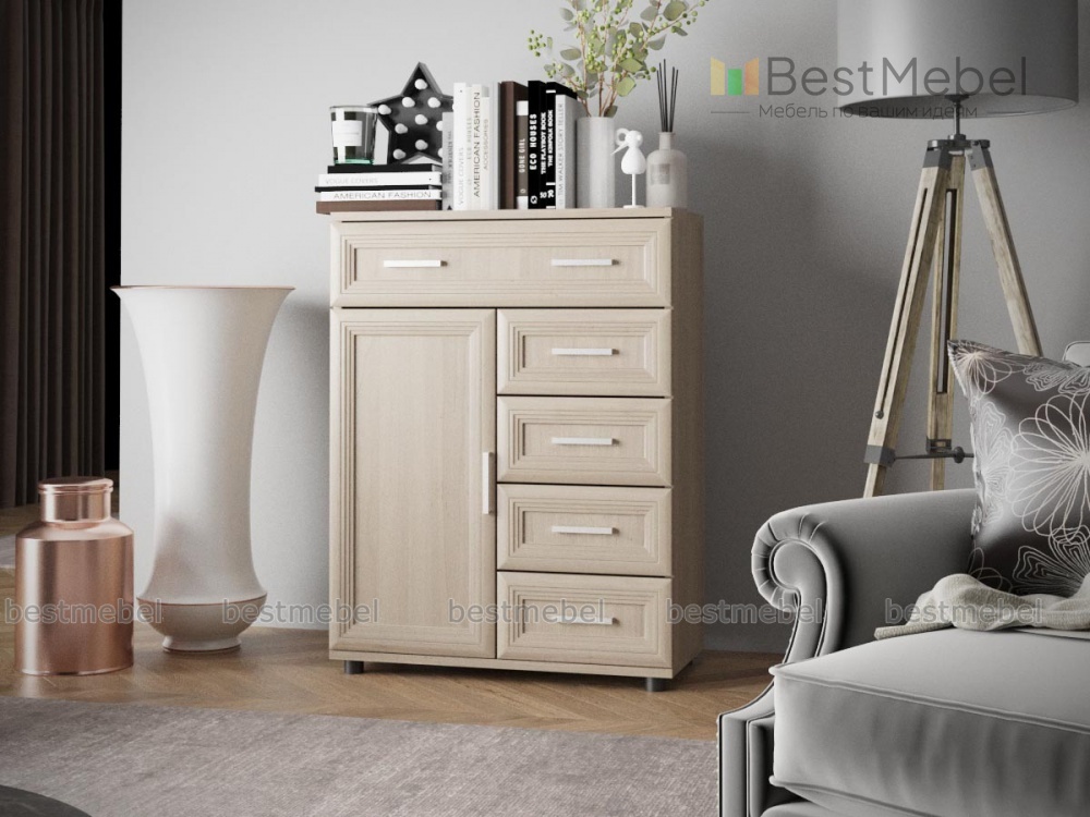 Комод мод.165 BMS отличается классическим дизайном, демократичной ценой и богатой палитрой древесных оттенков на выбор. Модель удобных средних габаритов универсальна и легко впишется в интерьер спальни, гостиной или прихожей. Наличие отделений разного типа позволит компактно разместить все необходимое. Под просторной столешницей располагаются большой выдвижной ящик, четыре малых и распашная секция с полкой. Фасады декорированы рамками и неброской фурнитурой. Купить комод мод.165 BMS недорого приглашаем в наш интернет-магазин.