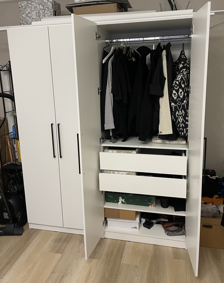 Шкаф распашной Остин Лайт 23 BMS (700х2050х440), заказ 00000204767. Делали ремонт в коридоре и необходимо было заменить два шкафа, прихожую и дверцы на антресолях. Всё заказали здесь. Заказывали оба шкафа Остин через сайт (Лайт 3 BMS и этот Лайт 23 BMS). Самостоятельно поменяли размеры, цвет фасадов (Тэффи L) и цвет самого шкафа (серый), кромку лицевых частей на 2 мм, ручки оставили эти (понравились), петли поменяли на Блюмовские с доводчиками. Внутри поменяли штангу на полки (6 шт), сделали перфорацию, чтобы в процессе эксплуатации можно было переставлять полки на нужную высоту. После оформления заказа на сайте, перезвонила менеджер (минут через 20), еще раз всё уточнила и перепроверила, помогла с точными размерами, чтобы шкаф точно встал в нишу. Всё изготовили быстро. Позвонили и согласовали день доставки. Доставка хорошая, оформляли с поднятием в квартиру. Комплектация полная, всё целое. Выдали документы с гарантией и телефоном компании по сборке. Позвонили туда и через час с нами связался сборщик, согласовали уже с ним дату и время. Отличный парень по сборке мебели. Собрал нам сразу два шкафа и прихожую за 4 часа. Спасибо, что появился такой интернет-магазин! Цена шкафа намного ниже, чем заказывать в компаниях по изготовлению мебели на заказ (узнавали в 5 компаниях) и сроки изготовления в несколько раз быстрее. Спасибо, что появился такой интернет-магазин!