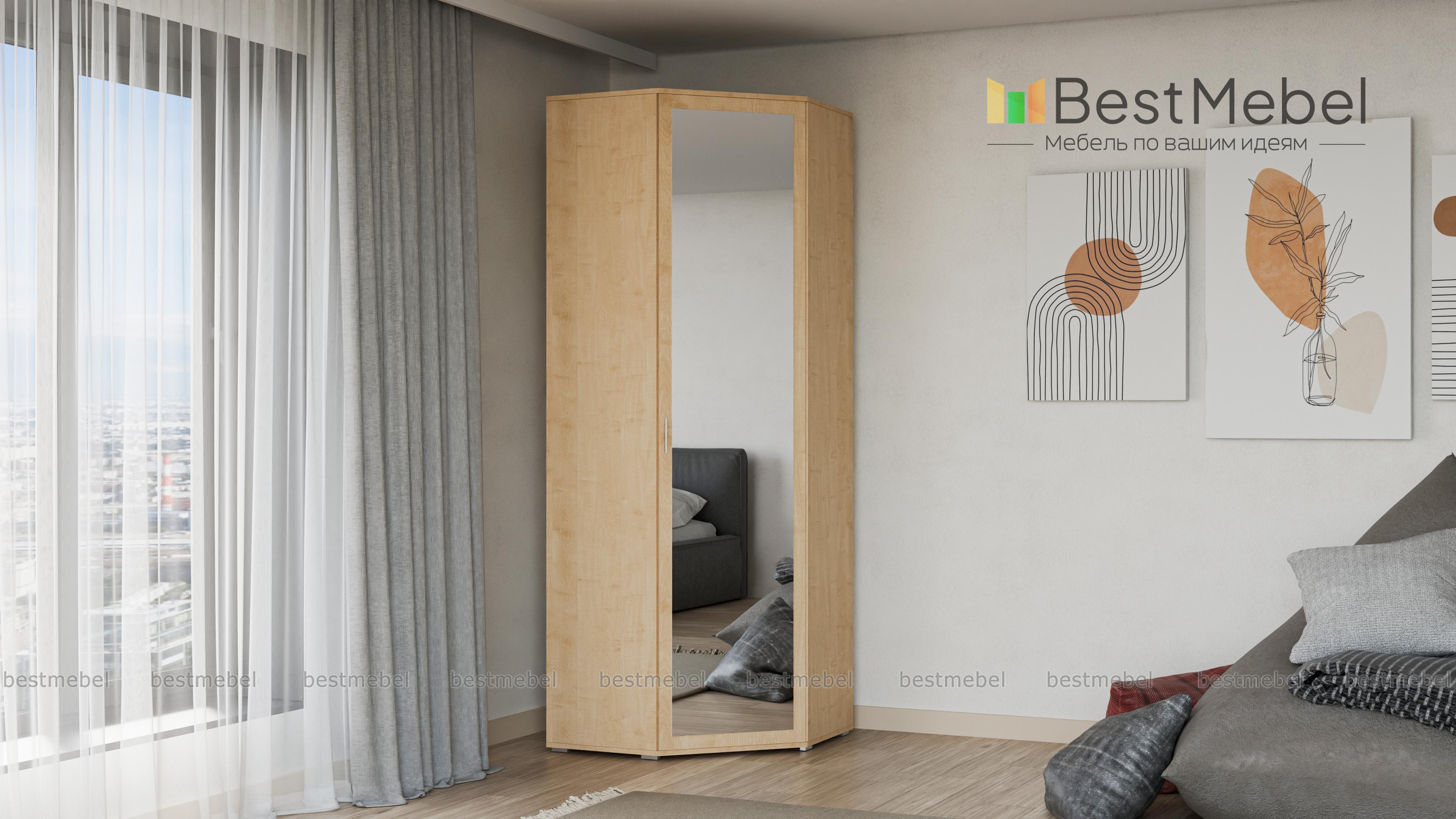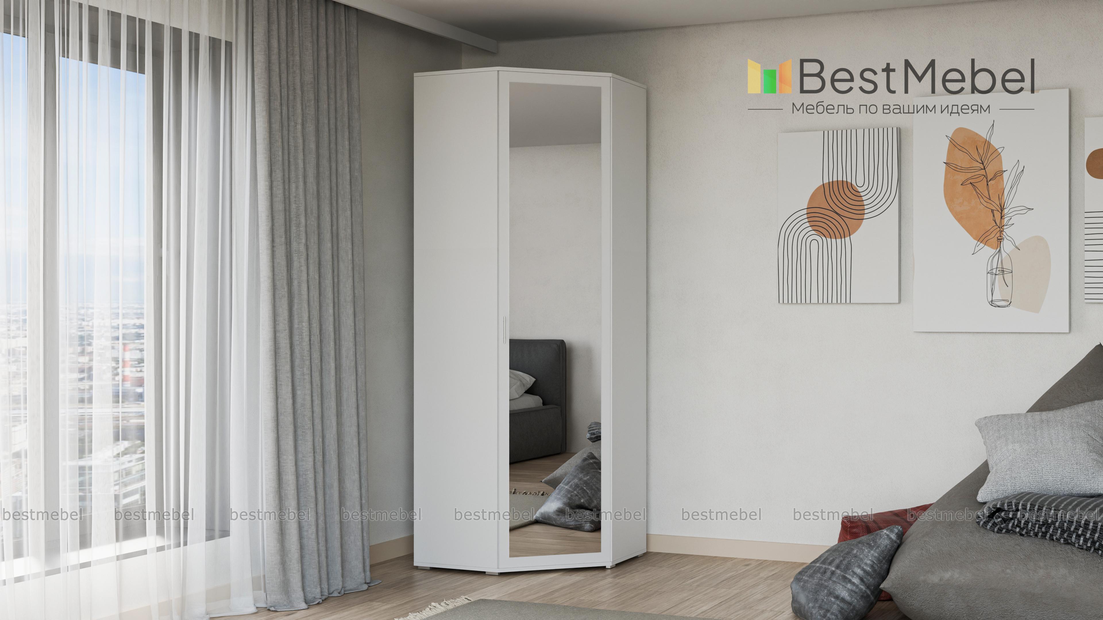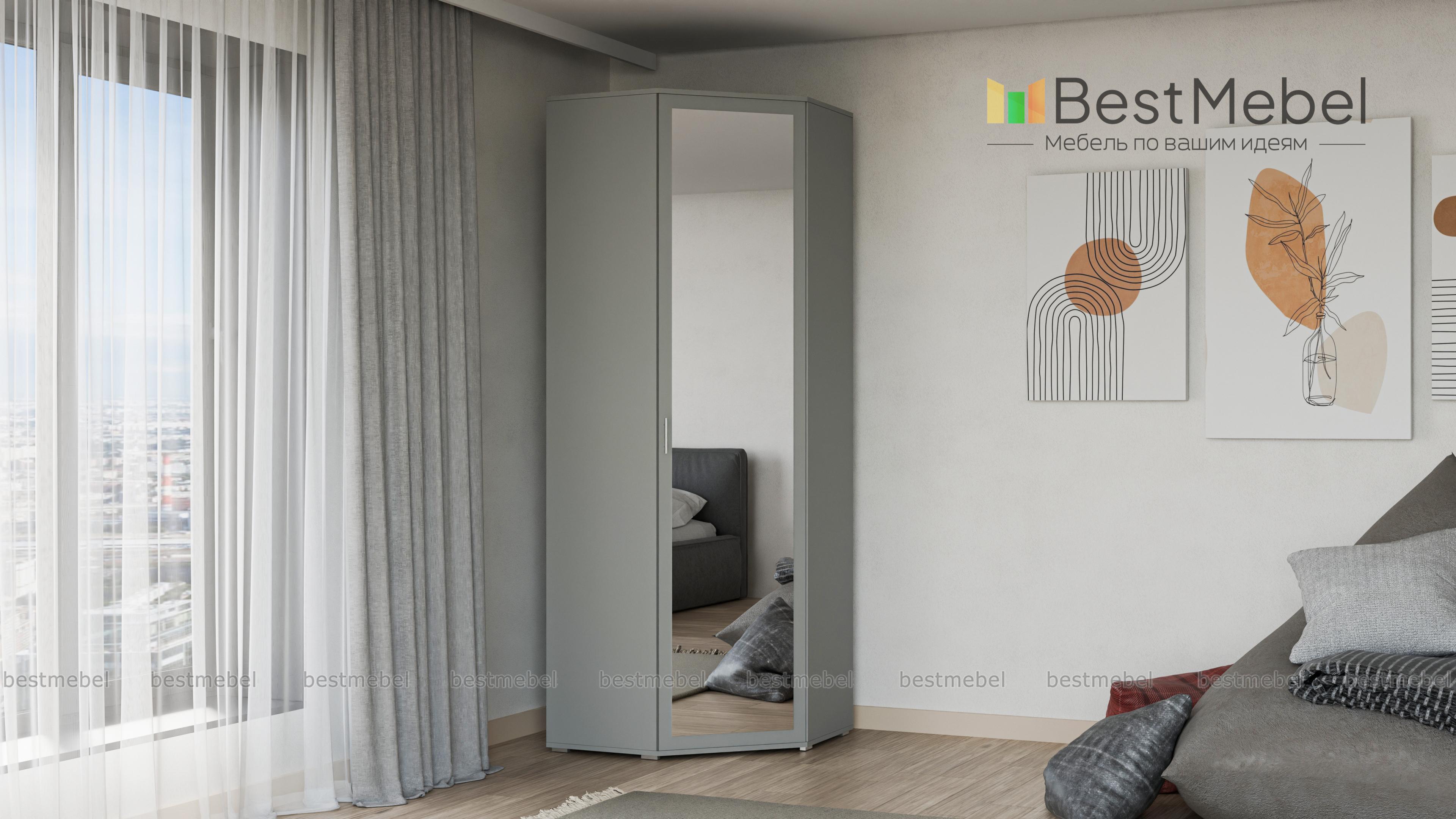 Шкаф угловой ШК-814 Мелисса BMS - удобный предмет мебели с эргономичной формой. Незаметно занимая свой угол, он вместит в себя множество полезных вещей: одежды, обуви, бытовых предметов. Для этого в базовой комплектации модели предусмотрено 5 полок, штанга для плечиков и антресольный отдел.Привлекательный дизайн с зеркалом на дверце и аккуратными ножками, делающими шкаф легче визуально, станет украшением интерьера. Цветовое решение выбирается заказчиком индивидуально с помощью нашей палитры. Купить шкаф угловой ШК-814 Мелисса BMS недорого можно в нашем онлайн-магазине.