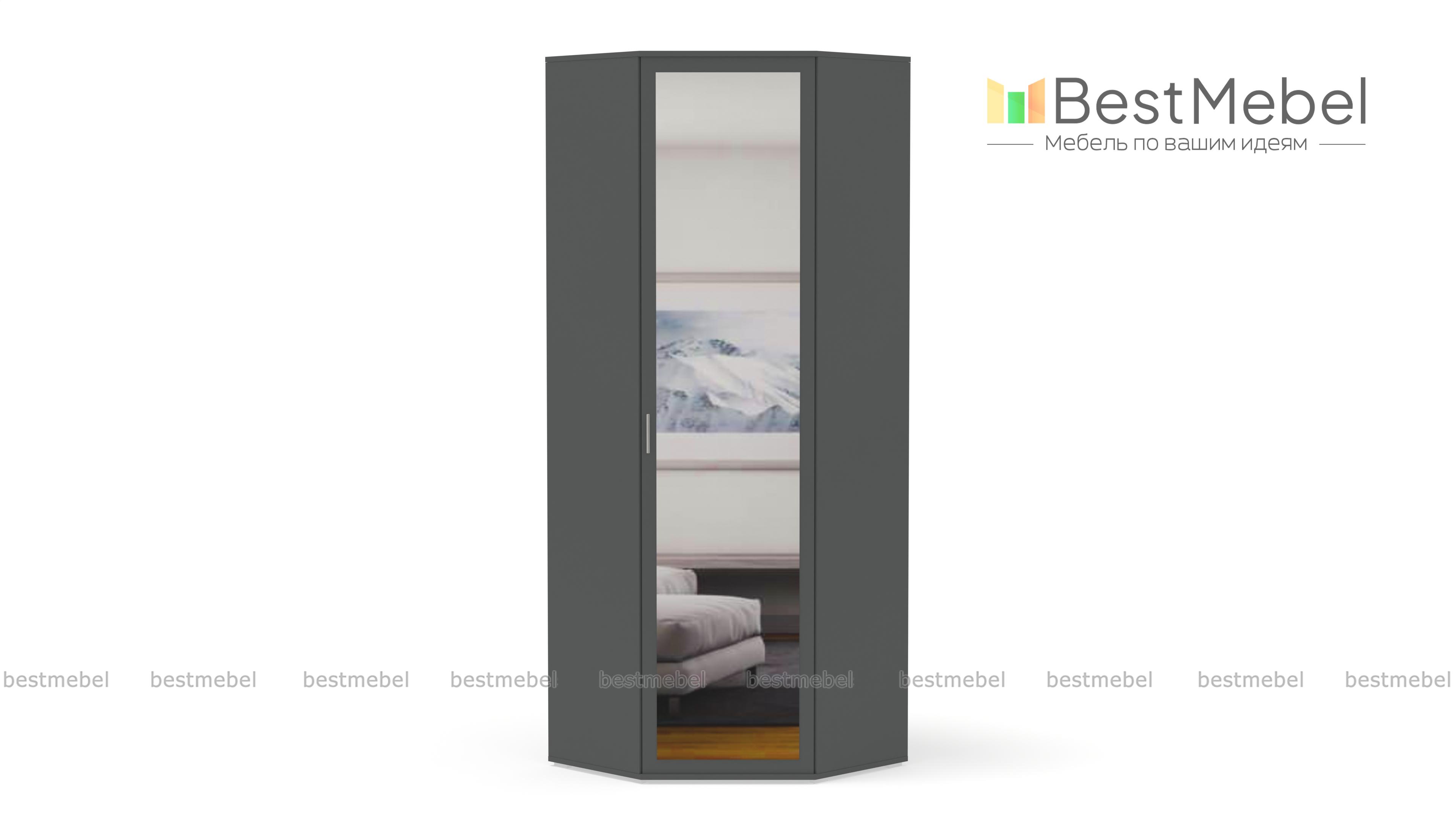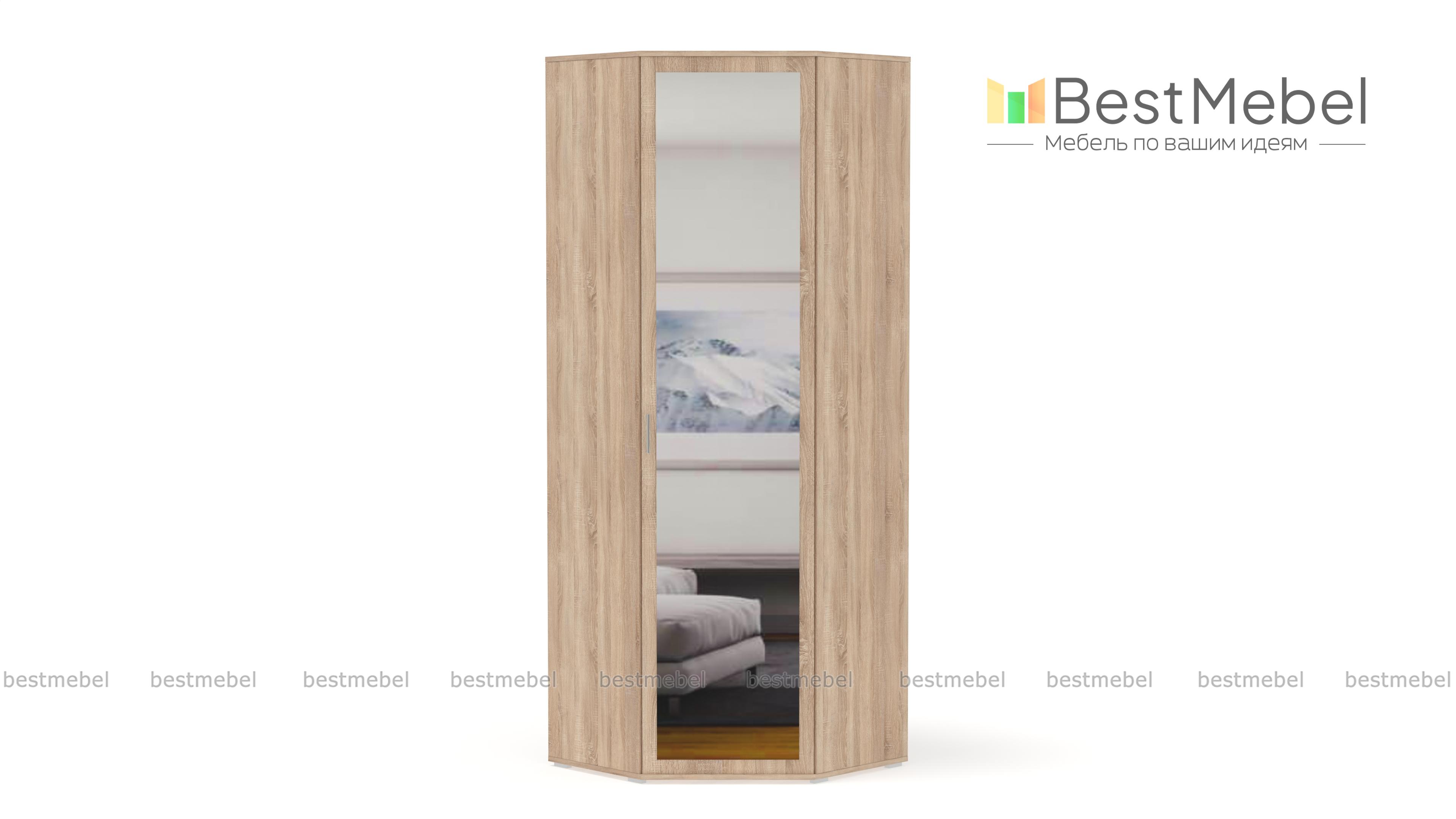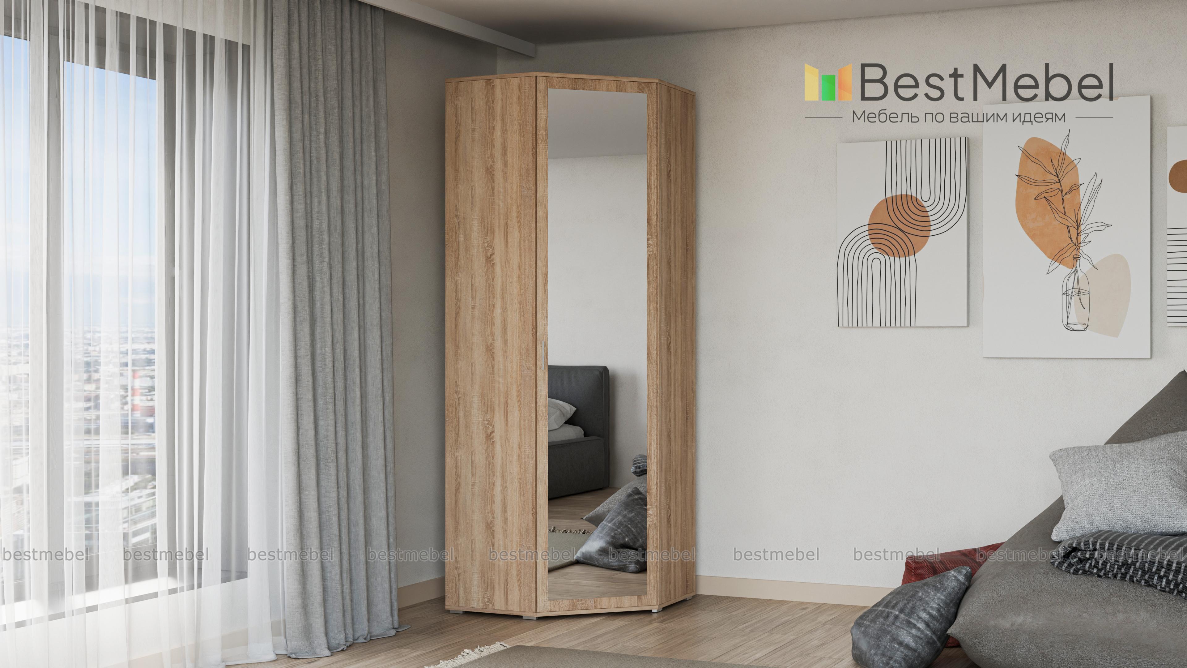 Шкаф угловой ШК-814 Мелисса BMS - удобный предмет мебели с эргономичной формой. Незаметно занимая свой угол, он вместит в себя множество полезных вещей: одежды, обуви, бытовых предметов. Для этого в базовой комплектации модели предусмотрено 5 полок, штанга для плечиков и антресольный отдел.Привлекательный дизайн с зеркалом на дверце и аккуратными ножками, делающими шкаф легче визуально, станет украшением интерьера. Цветовое решение выбирается заказчиком индивидуально с помощью нашей палитры. Купить шкаф угловой ШК-814 Мелисса BMS недорого можно в нашем онлайн-магазине.