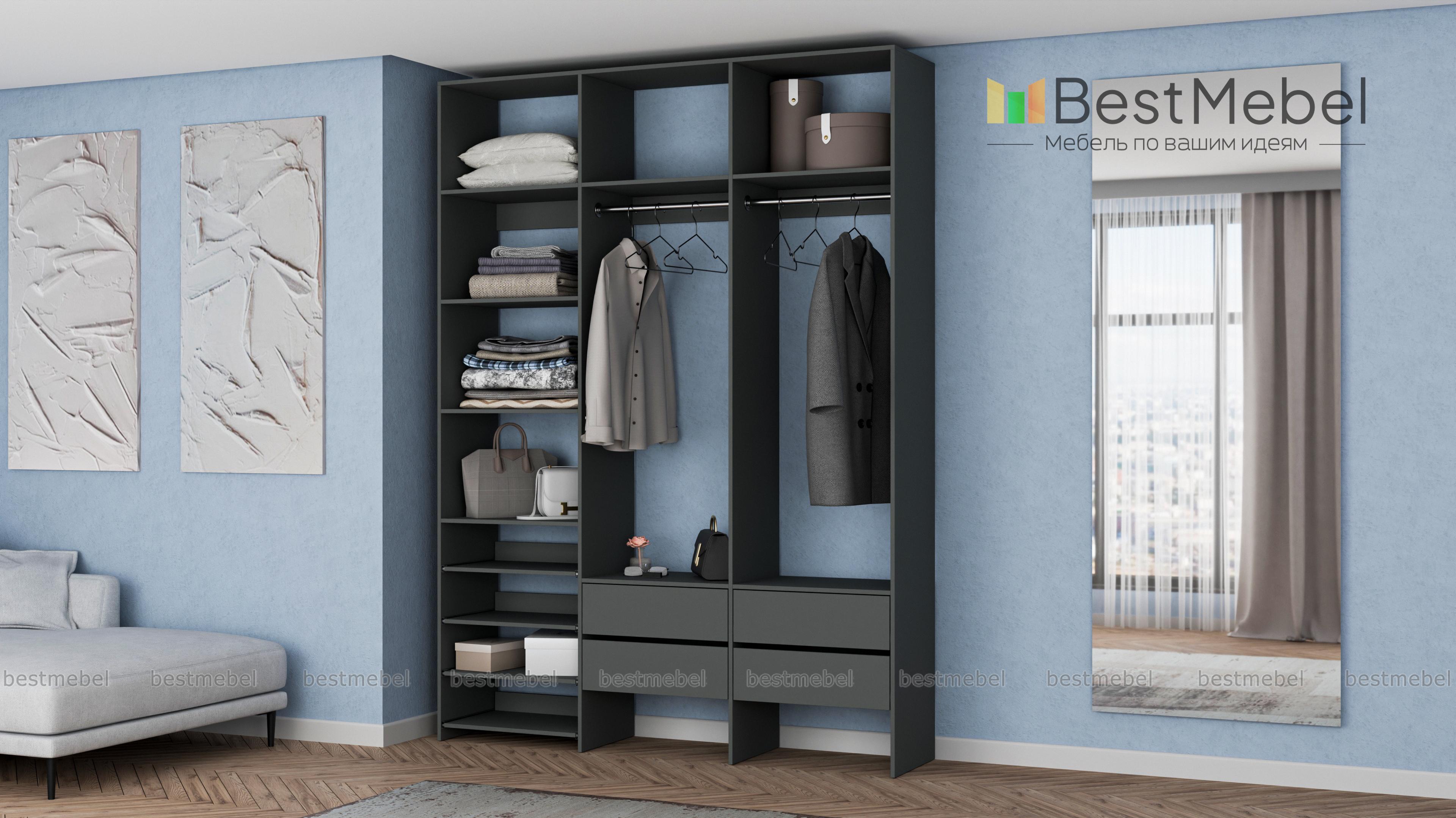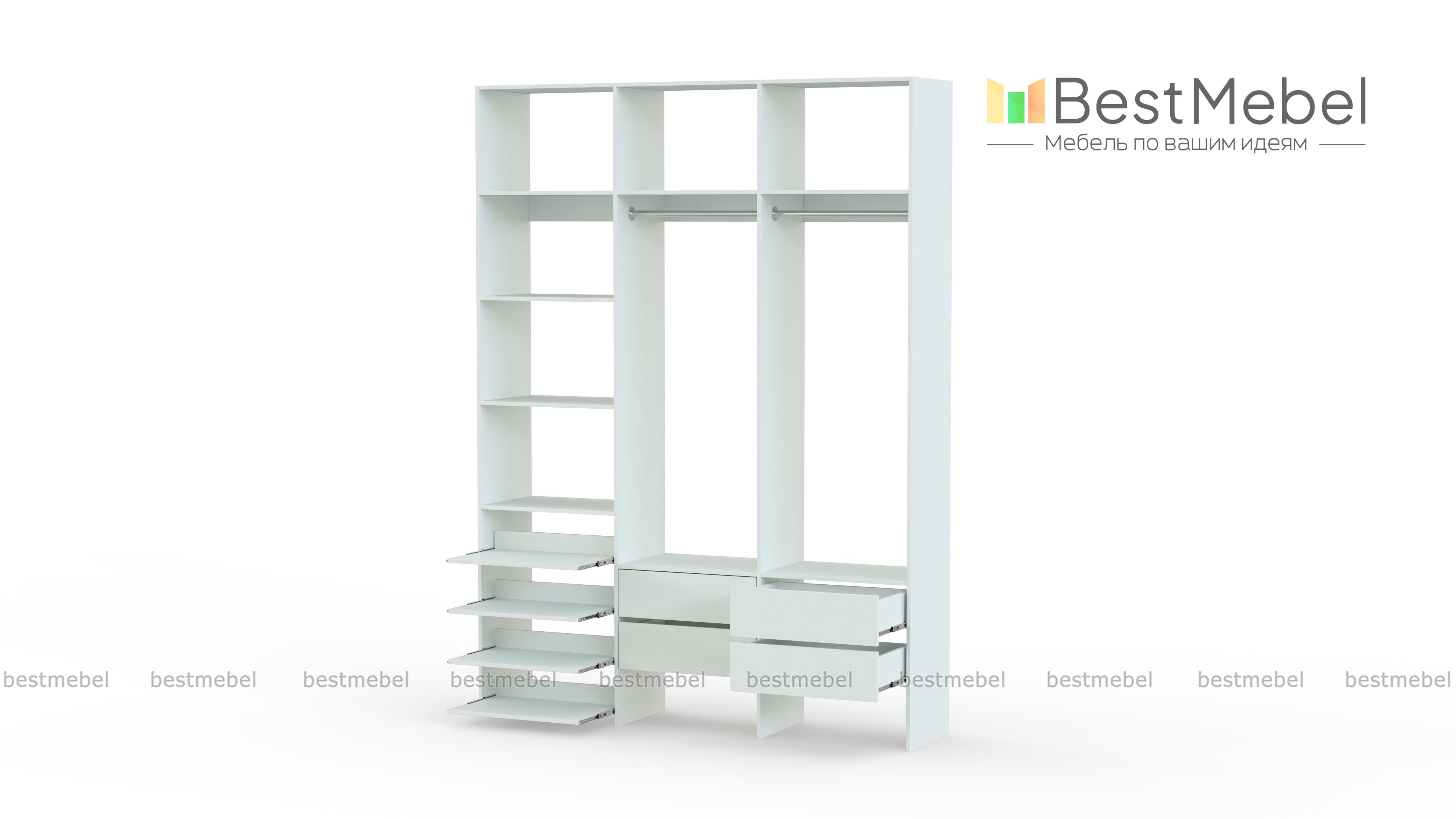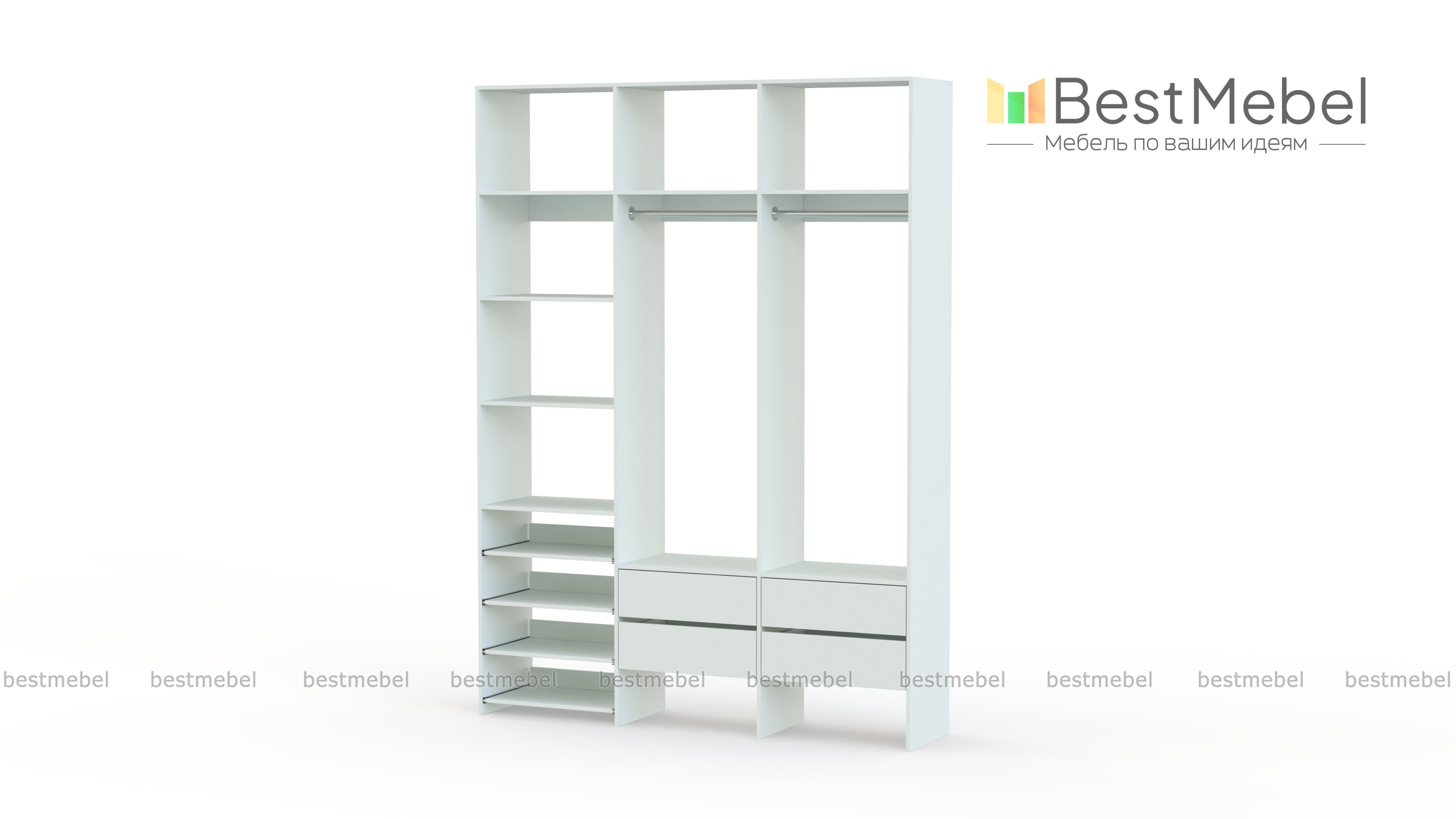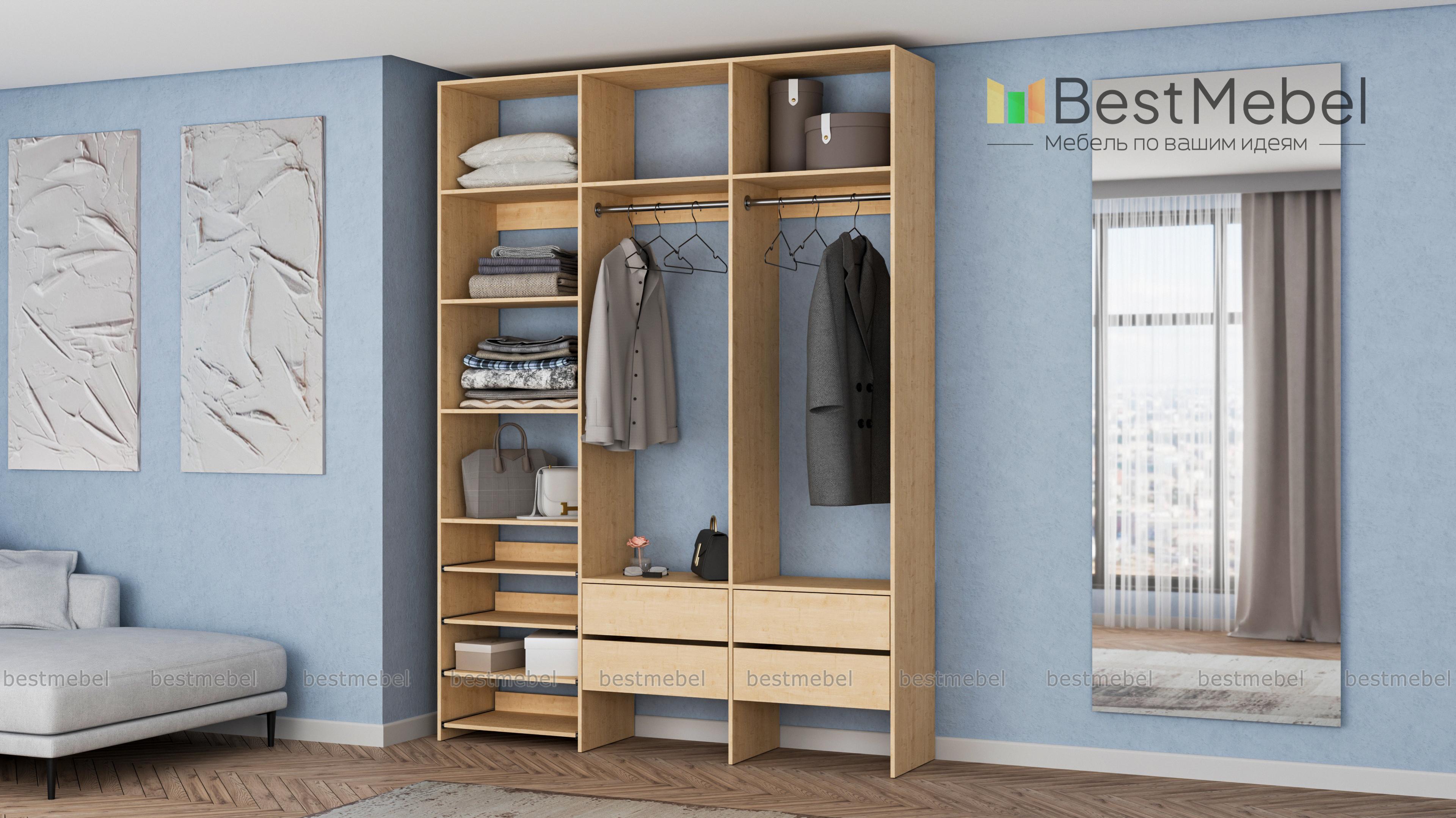 Стеллаж для одежды Мирта 98 BMS поможет вам организовать пространство в прихожей или гардеробной. Открытая система хранения включает в себя две платяные штанги, под которыми располагаются четыре ящика для мелочей, ряд выдвижных полок и стандартные бельевые. Прочная ламинированная ДСП, из которой изготовлен стеллаж, способна выдерживать большие нагрузки. Купить стеллаж для одежды Мирта 98 BMS, выполненный по индивидуальным размерам, приглашаем в наш интернет-магазин.
