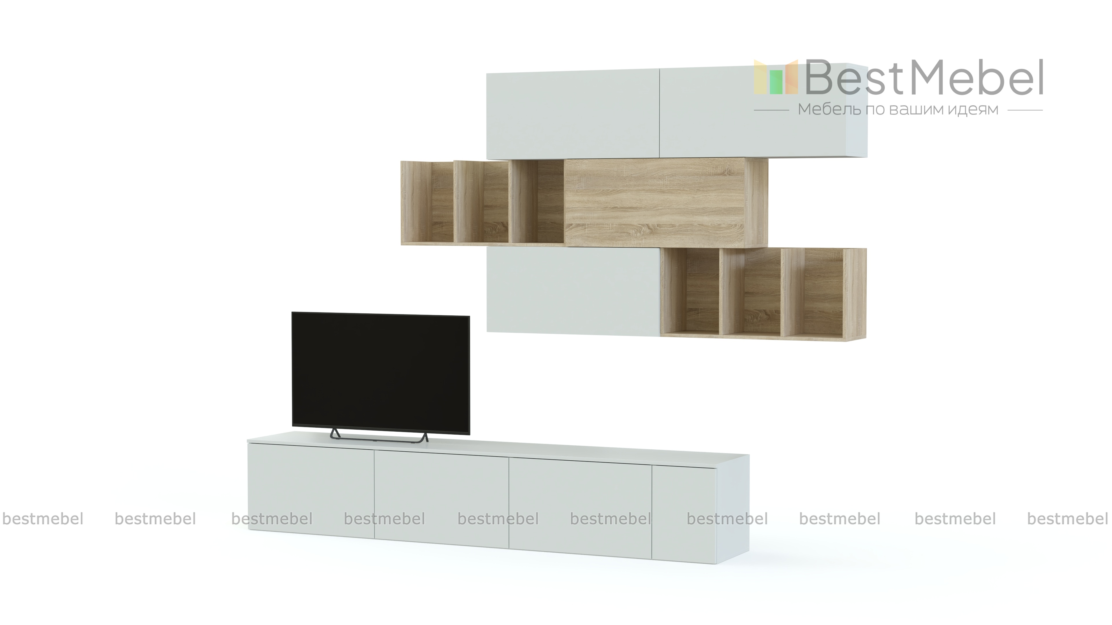 Гостиная Фредерик 5 BMS состоит из отдельных лаконичных модулей, которые вы сможете легко комбинировать друг с другом, а сочетание белого оттенка и древесных полок сделает атмосферу особенно уютной. Модульная система включает в себя широкую низкую тумбу с четырьмя отделениями, навесные горизонтальные шкафчики с открывающимися вверх дверцами и открытые полки для книг и интерьерных украшений. Купить гостиную Фредерик 5 BMS и интересно оформить зону размещения ТВ вам всегда поможет наш интернет-магазин.