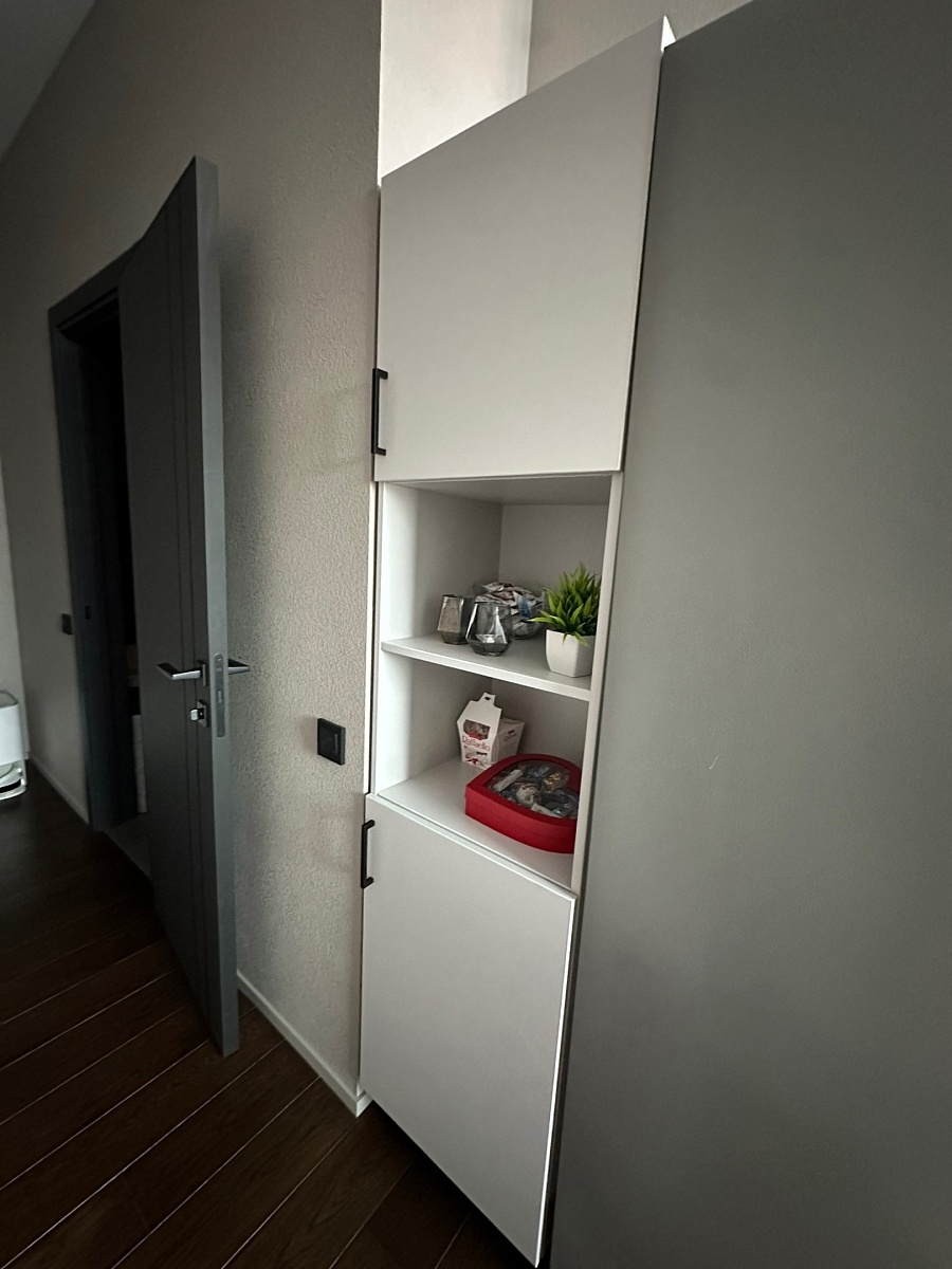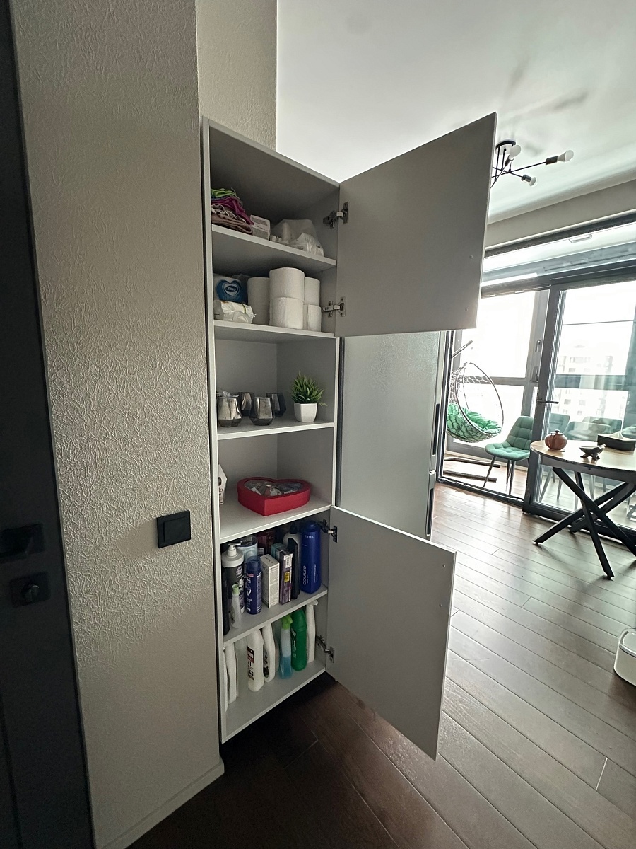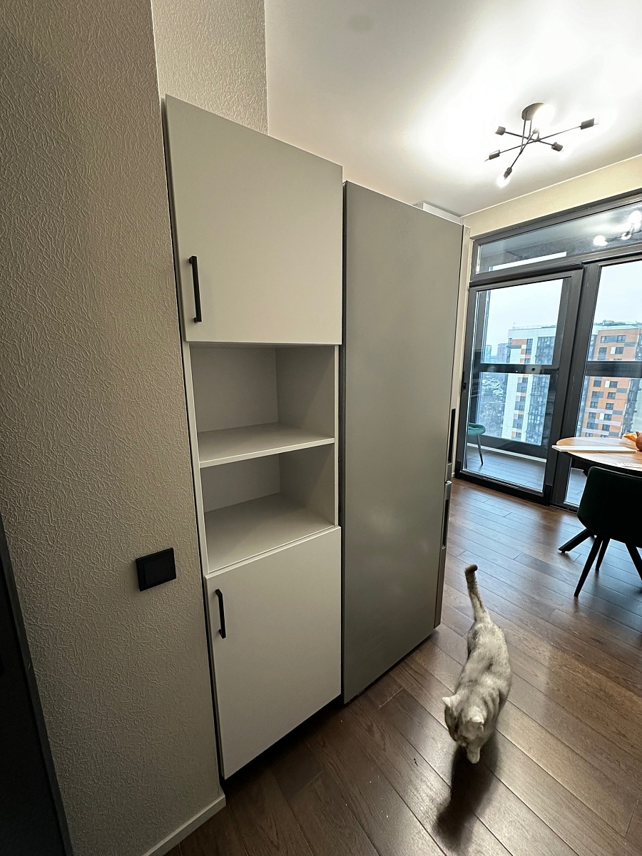Заказ 00000950667. Отличный пенал за свои деньги! Хотели изделие, чтобы были закрытые полки для хранения бытовой химии + открытые полочки для дизайна. Очень удобно, что можно выбрать размеры, так как нам необходимо было закрыть зазор между холодильником и стеной. Цвет отлично вписался в интерьер (совсем не маркий), доводчики работают хорошо, закрытые полки вместительные. Рекомендую данное изделие к покупке!