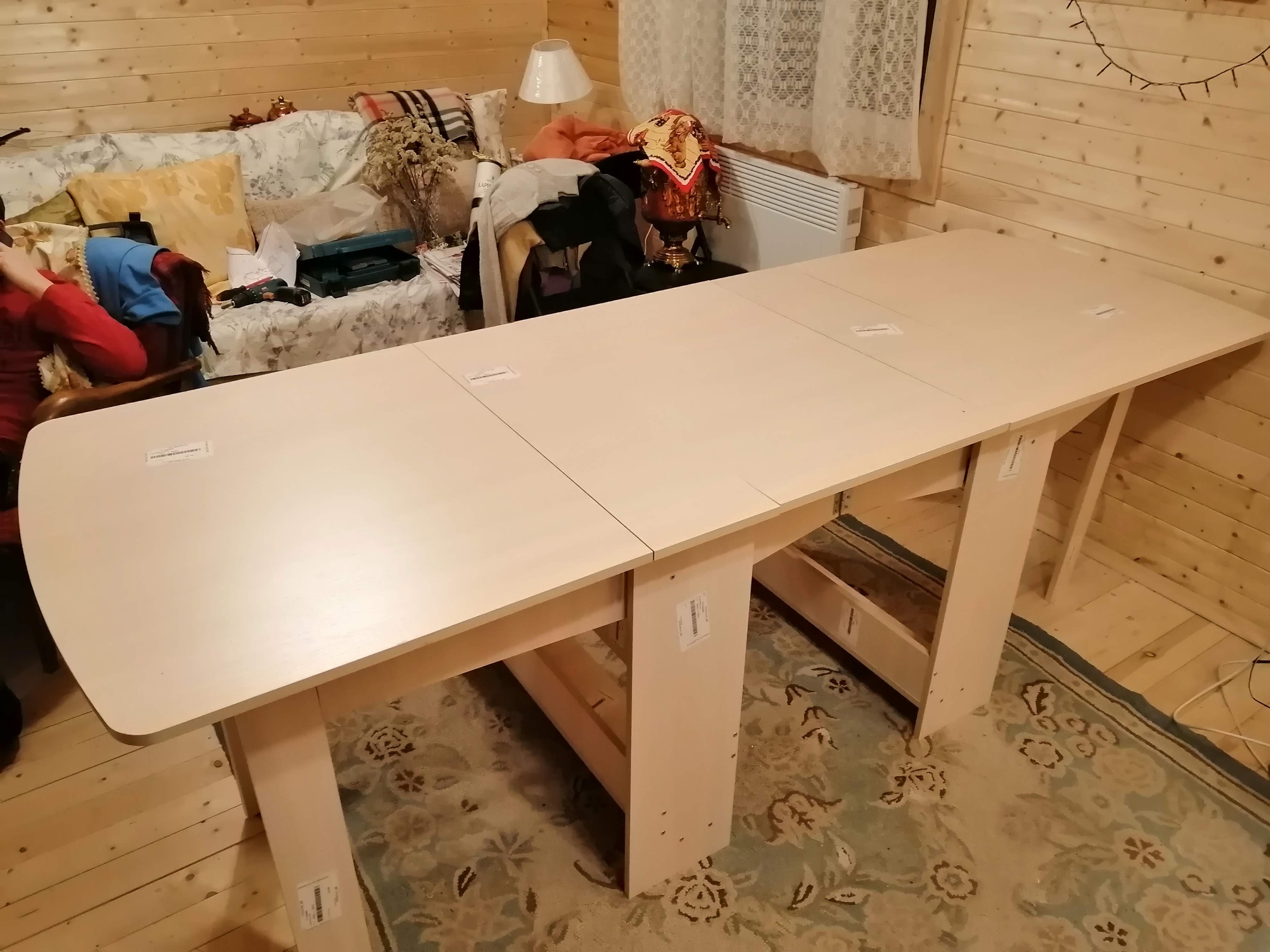 Заказывал стол на дачу длиной 2400. Собрали без проблем. Полностью разложенный позволяет усадить 8 человек с запасом. За столом можно сидеть в значительно большем количестве, но начинают мешать широкие средние ноги. За то он очень быстро трансформируется в широких пределах. Надо иметь ввиду, что центральная вставная часть столешницы никак не крепится. Если соберетесь двигать полностью разложенный стол, то части столешницы будут "елозить" между собой.
